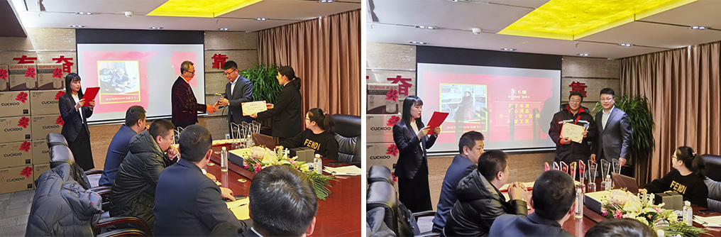 譚貴利總經(jīng)理親自為十二名獲獎(jiǎng)?wù)哳C發(fā)了榮譽(yù)證書(shū)、獎(jiǎng)杯及獎(jiǎng)品(韓國(guó)原裝進(jìn)口的福庫(kù)電飯煲一臺(tái))。